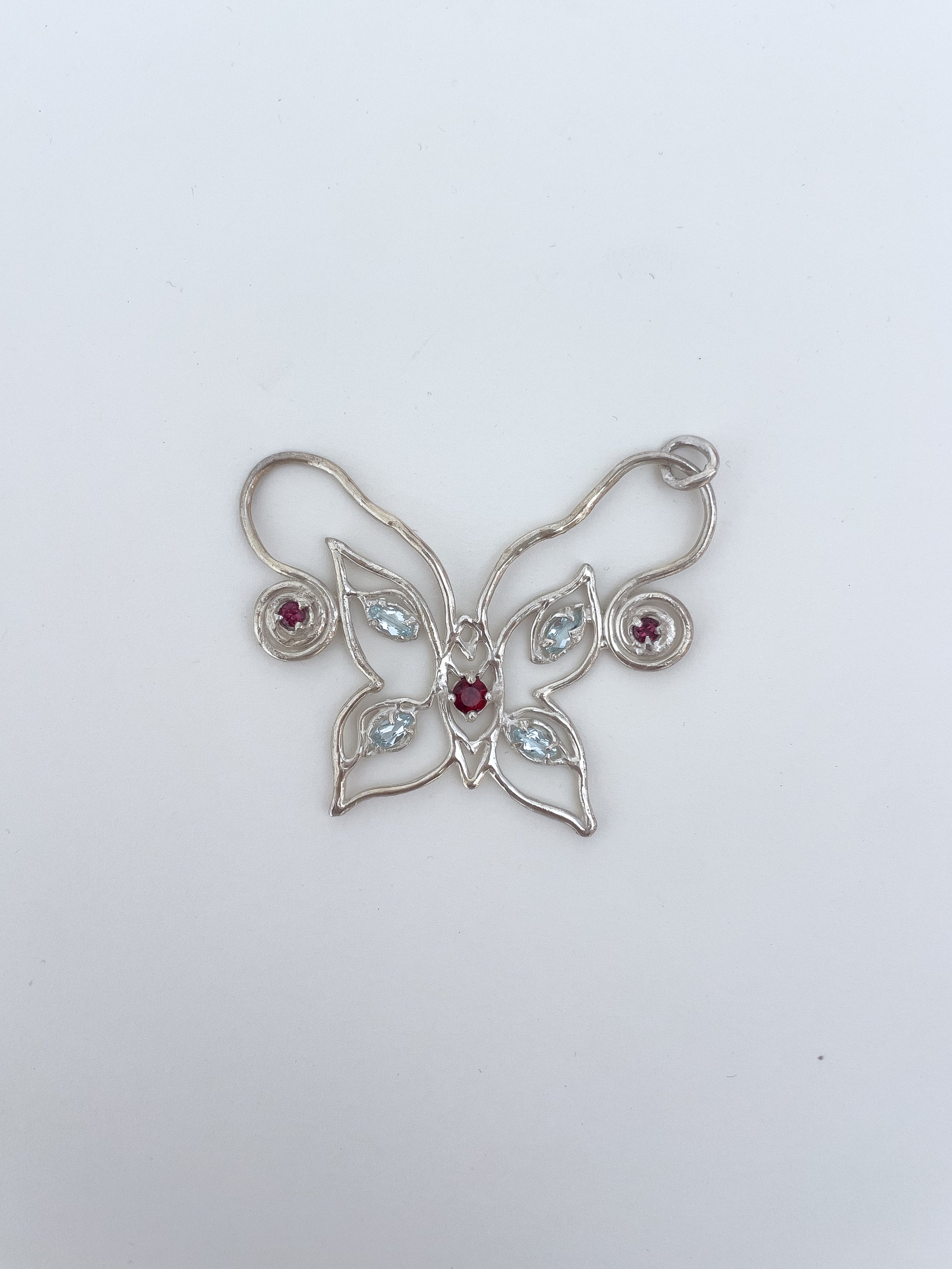 Hand sculpted and cast in sterling silver with natural garnets and aquamarines